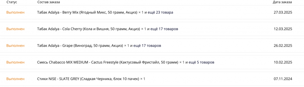 очень долго искали в своем городе смесь для кальяна без никотина,но к сожалению ничего не было в продаже,сказали не актуально для нашего Волгодонска.В инете нашла этот сайт и решила заказать,ну а вдруг не развод,и спасибо вам большое все пришло целое и сегодня буду наслаждаться кальяном со смесью "Nicotine -Free".Вообщем ребята заказывайте,советую.И еще из плюсов посылка должна была прийти 17.03.2025г.,но пришла раньше 13.03.2025г.СПАСИБО)))